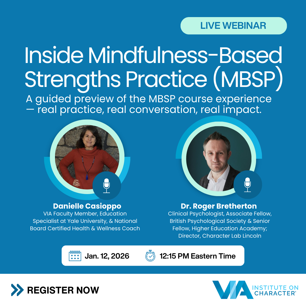 This free, interactive webinar brings together Danielle Casioppo and Dr. Roger Bretherton — experienced Mindfulness-Based Strengths Practice (MBSP) trainers and VIA Faculty Members — for an honest, grounded conversation about mindfulness, character strengths, and what it truly means to live the practice.