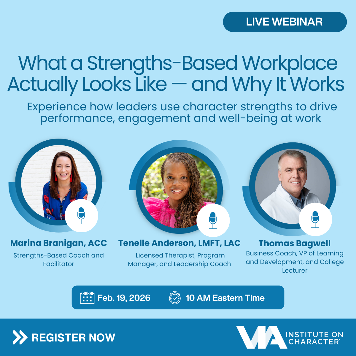 Get an early look at VIA's newest offering in organizational development: Workplaces at Their Best courses. Discover how this suite of powerful courses and learning pathways can transform personal engagement and create positive change in the workplace. We also talk about how to become a certified VIA Workplace Consultant. (Video originally recorded on August 7, 2024)